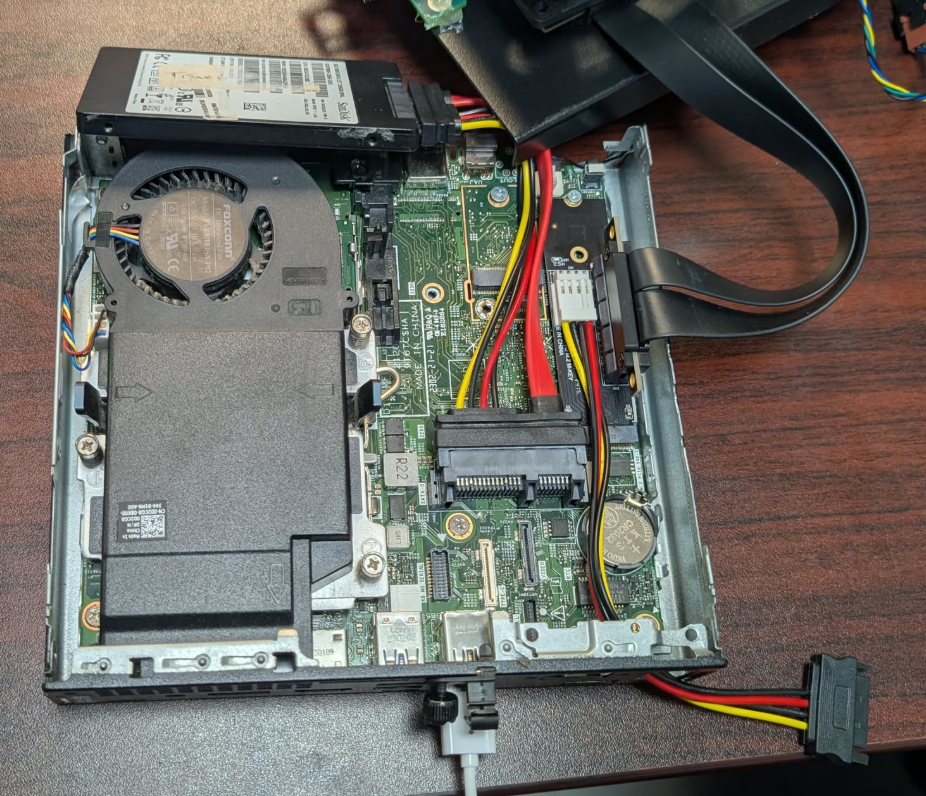 I wanted to use a Dell Micro form factor computer as a host. To use this device, I needed to externally power the 10GB Mellanox card due to the built-in SATA on the mobo not delivering the full 12v needed to power the card. First, to connect the card I'll be using an adapter in the NVMe slot, NVMe to PCIe X4. As you can see, the specific MFF case I was using had a knockout that I was able to route the SATA adapter through. To route the PCIe cable through, I cut off a bit of the side latch and bent the cover a bit to give enough space to accommodate the cable. I did also have to use a SATA extension cable to be able to fit the SSD, since the adapter blocks the way. I could also have just bought a small M.2 NGFF SSD to install in the WiFi slot, but I was using what I already have on hand. This drive is to install Proxmox.